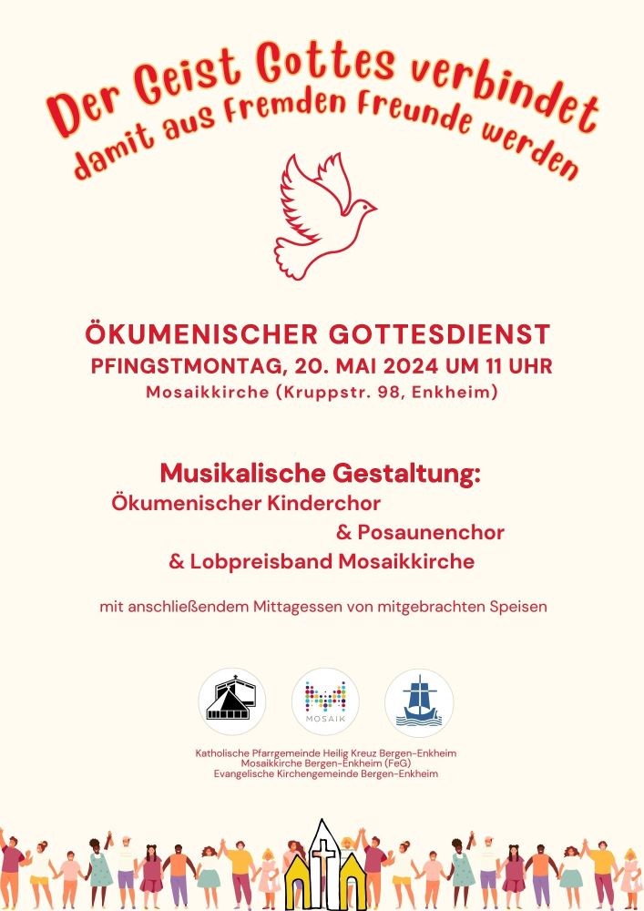 Zu einem großen Pfingstgottesdienst für alle Generationen am Pfingstmontag, 20. Mai laden die christlichen Kirchen in Bergen-Enkheim gemeinsam ein. Zusammen mit der Mosaikkirche und der Katholischen Pfarrgemeinde feiern wir um 11 Uhr in der Mosaikkirche, in der Kruppstr. 98 in Enkheim, einen ökumenischen Gottesdienst unter dem Motto "Der Geist Gottes verbindet - damit aus Fremden Freunde werden". Pfarrerin Schneider gestaltet den Gottesdienst gemeinsam mit Pfarrer Hahner und Pastor Bergfeld sowie einem ökumenischen Team. Musikalisch wird der Gottesdienst vom ökumenischen Kinderchor, dem Posaunenchor und Lobpreisband der Mosaikkirche gestaltet. Im Anschluss wird zum gemeinsamen Mittagessen eingeladen. Alle sind eingeladen etwas zum Buffet beizutragen.