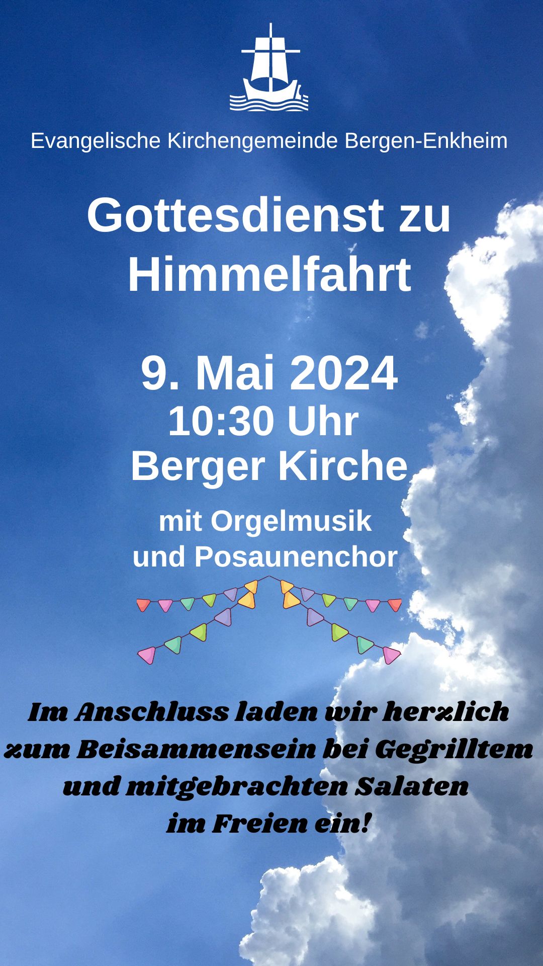 Herzliche Einladung zum Gottesdienst am Himmelfahrtstag, 9. Mai um 10:30 Uhr in der Berger Kirche. Der Gottesdienst wird musikalisch vom Posaunenchor gestaltet und von Klaus Bauermann an der Orgel.