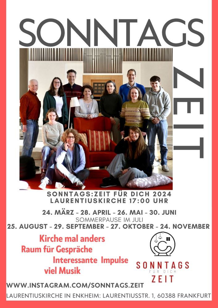 Am Sonntag, 28. April um 17 Uhr wird in der Laurentiuskirche in Enkheim wieder in gemütlicher Atmosphäre Gottesdienst unter dem Motto „SONNTAGS:ZEIT für Dich“ gefeiert. Diesmal steht das Thema „Augenblick“ im Mittelpunkt. Zu Gast auf dem roten Sessel sind Vikarin Anna Berting (Kirchengemeinde Kilianstädten und Oberdorfelden) und Gabriele Ruys (TouchLife Massagepraktikerin). Neben inspirierender Musik wird es wieder Zeit für Gespräche bei einem guten Getränk und einem kleinen Snack geben. Weitere Informationen sind auf dem Instagram Account www.instagram.com/sonntags.zeit zu finden.