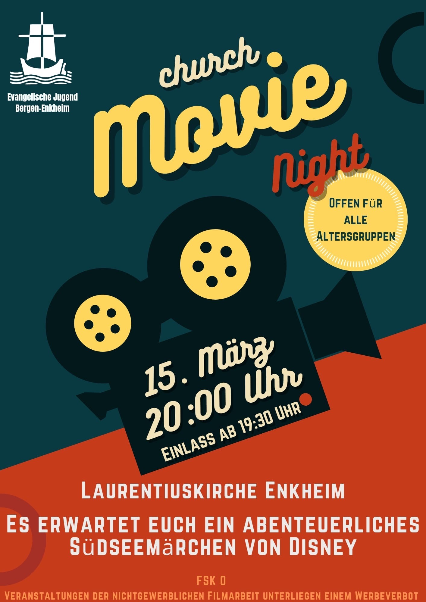 Die Evangelische Kirchengemeinde Bergen-Enkheim lädt zur CHurchMovienight in die Laurentiuskirche (Laurentiusstr. 1 in Enkheim) ein. Am Freitag, 15. März verwandelt sich die Kirche in einen Kinosaal. Die Besucher erwartet ein abenteuerliches Disney Märchen über ein Mädchen in der Südsee. Für Popcorn und Getränke ist gesorgt. Bringen Sie sich gerne eine gemütliche Decke und freuen Sie sich auf einen unvergesslichen Abend! Der Kinoabend beginnt um 20 Uhr.