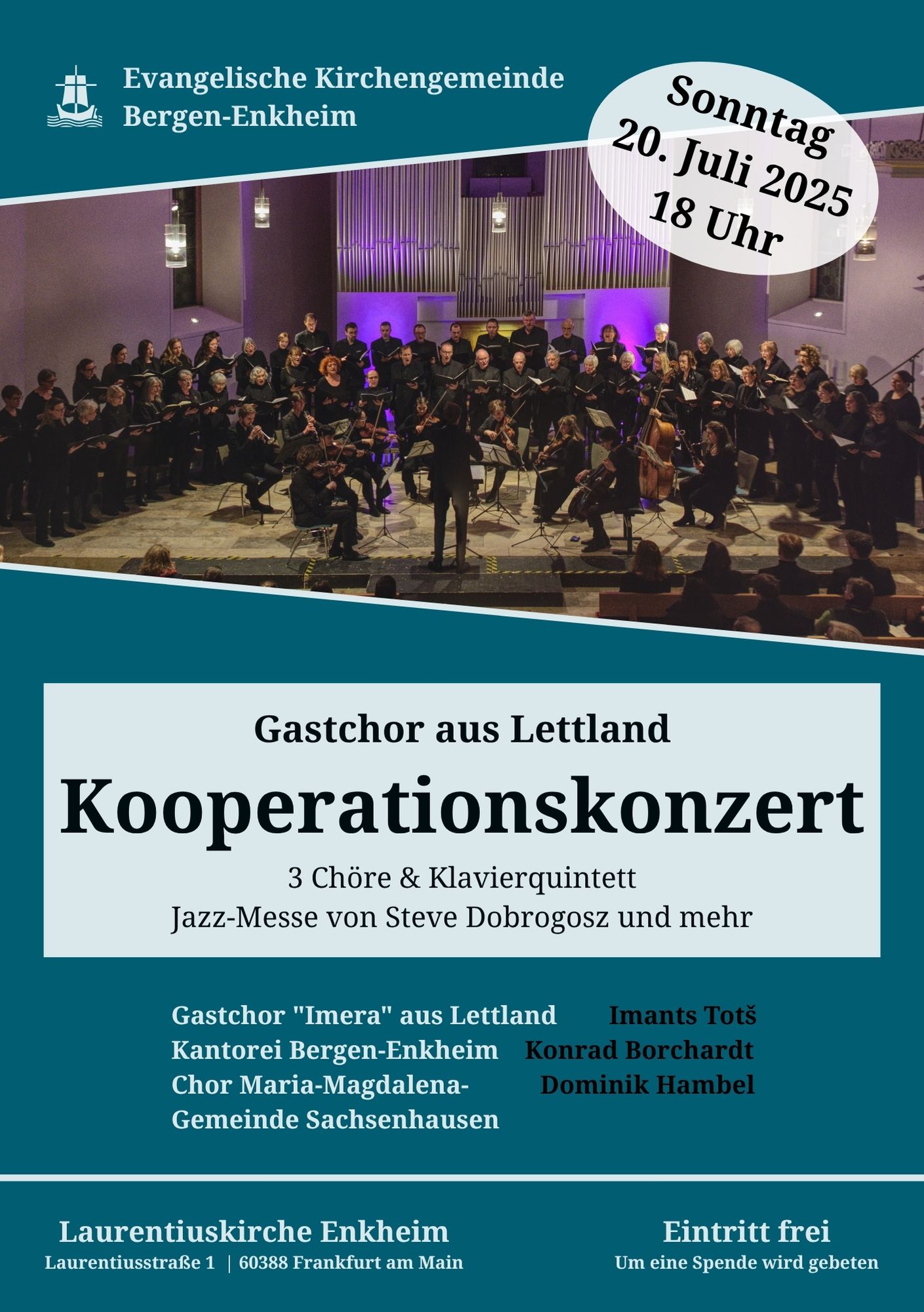 Die Kantorei Bergen-Enkheim führt zusammen zwei weiteren Chören die die Messe des Jazz-Komponisten Steve Dobrogosz auf. Zusammen mit dem Chor der Maria-Magdalena-Gemeinde und den Chören „Imera“ und „Rītu puse“ aus Lettland sowie einem Streichquintett und Klavier freut sich die Kantorei Bergen-Enkheim und ihr junger Chorleiter Konrad Borchardt über die besondere Kooperation.