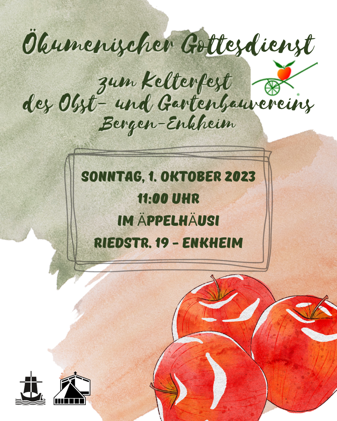 Der Gottesdienst am Sonntag, 1. Oktober findet, entgegen der Veröffentlichung in der Gemeindezeitung, nicht in der Berger Kirche statt, sondern im Äppelhäusi in der Riedstraße. An diesem Sonntag feiern wir um 11:00 Uhr (!) einen ökumenischen Gottesdienst zum Kelterfest des Obst- und Gartenbauvereins (OGV) Bergen-Enkheim. Herzliche Einladung!