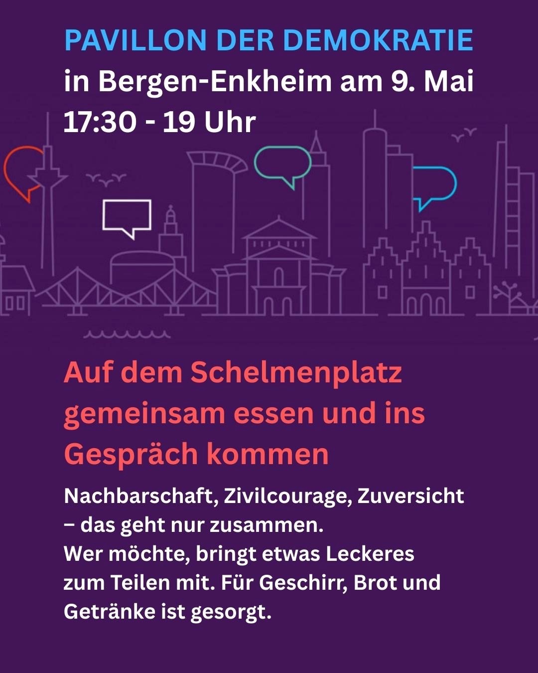 Der Pavillon der Demokratie zieht auch in diesem Jahr wieder durch die Frankfurter Stadtteile. Die Premiere 2025 der von Bürgermeisterin und Diversitätsdezernentin Nargess Eskandari-Grünberg initiierten Tour ist am 8. und 9. Mai in Bergen-Enkheim. Der Pavillon der Demokratie ist ein Projekt des Dezernats der Bürgermeisterin und der Stabsstelle Antidiskriminierung. Für mehr Miteinander, mehr Verständnis und mehr Respekt voreinander. Hier finden Sie das gesamte Programm: https://www.vielfalt-bewegt-frankfurt.de/de/pavillon-der-demokratie/bergen-enkheim