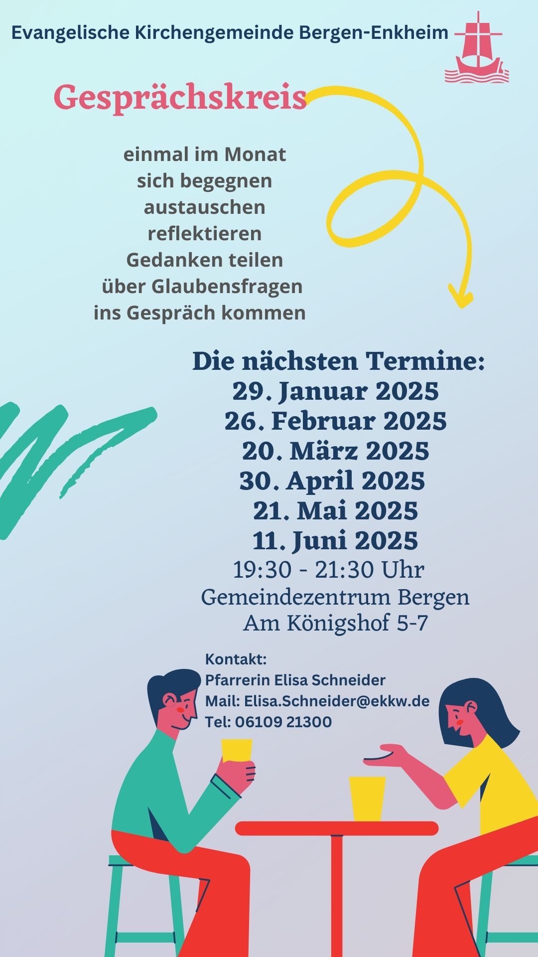 Einmal im Monat laden wir zu einem Gesprächskreis ein, um Begegnungen zu ermöglichen und Raum zu geben, um ungezwungen miteinander über Glaubensfragen und Aktuelles ins Gespräch zu kommen.