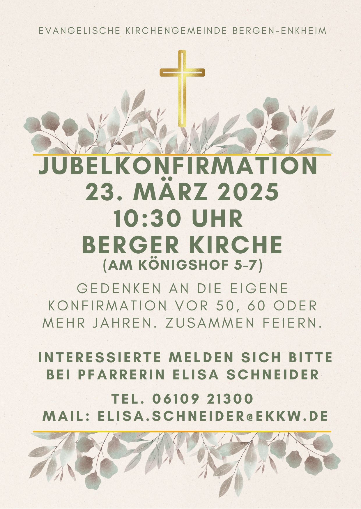 Der Gottesdienst zur Jubelkonfirmation findet am 23. März um 10:30 Uhr in der Berger Kirche (Am Königshof 5-7) statt.
