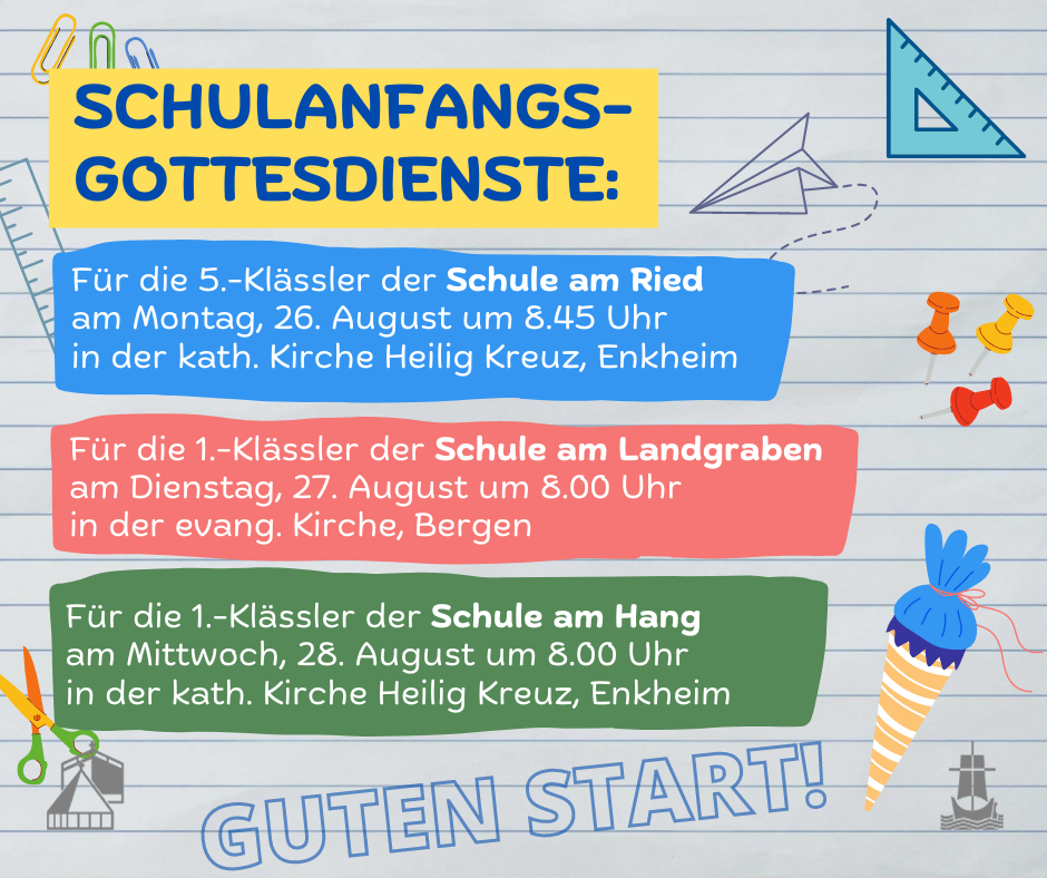 Für die 1.-Klässler der Schule am Hang am Mittwoch, 28. August 2024 um 8.00 Uhr in der kath. Kirche Hl. Kreuz, Enkheim