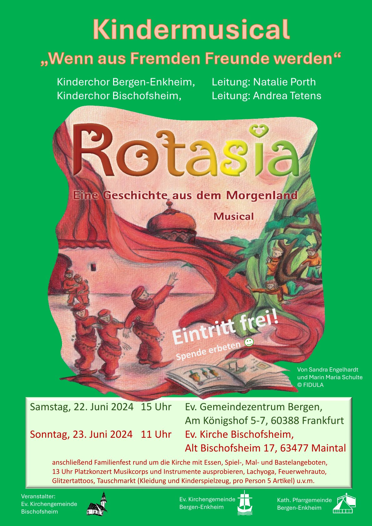 Der ökumenische Kinderchor „Gottesnote“ Bergen-Enkheim und der Kinderchor Bischofsheim führen am Samstag, 22. Juni um 15 Uhr im Gemeindezentrum Bergen (Am Königshof 5-7) das Musical "Rotasia" auf. Die Chorleiterinnen Natalie Porth und Andrea Tetens und die Kinder freuen sich auf viele Besucher!