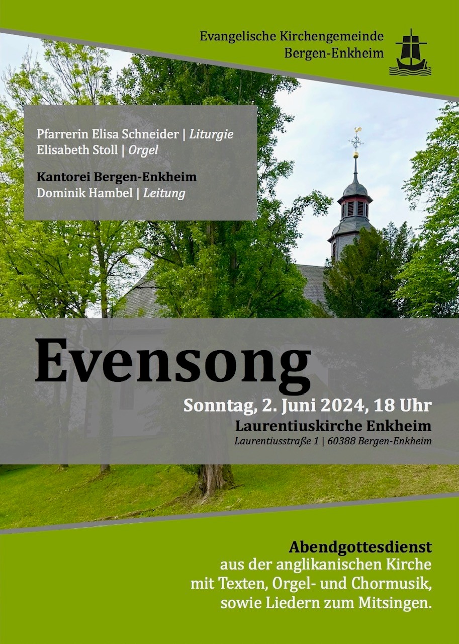 Die Kantorei Bergen-Enkheim lädt am Sonntag, den 2. Juni um 18 Uhr zu einem Evensong in die Laurentiuskirche nach Enkheim ein.